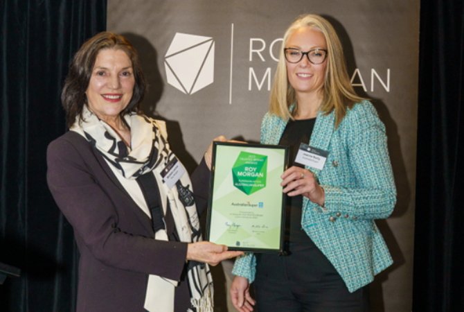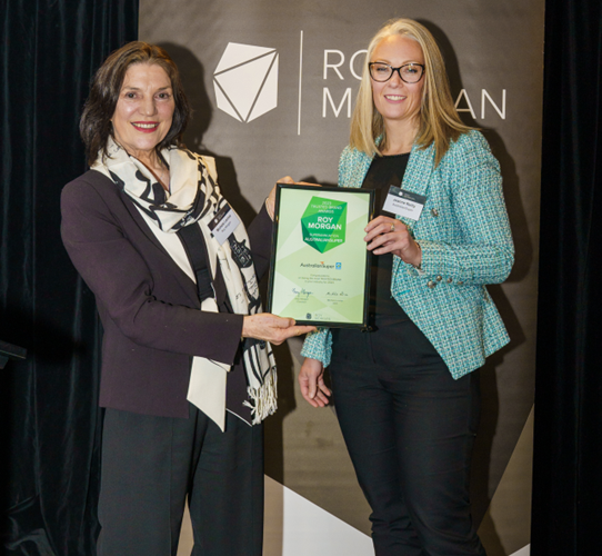 Picture: Roy Morgan CEO Michele Levine presents Head of Member Growth & Marketing of AustralianSuper, Joanne Reilly, with the ‘Most Trusted Brand for Superannuation’ Award for 2023.
