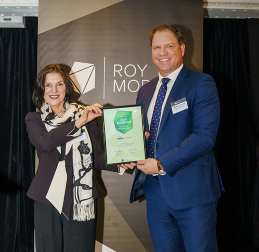 Picture: Roy Morgan CEO Michele Levine presents NRMA Insurance’s Insurance Executive General Manager Matthew Bennett with the ‘Most Trusted Brand for Insurance’ Award for 2023.