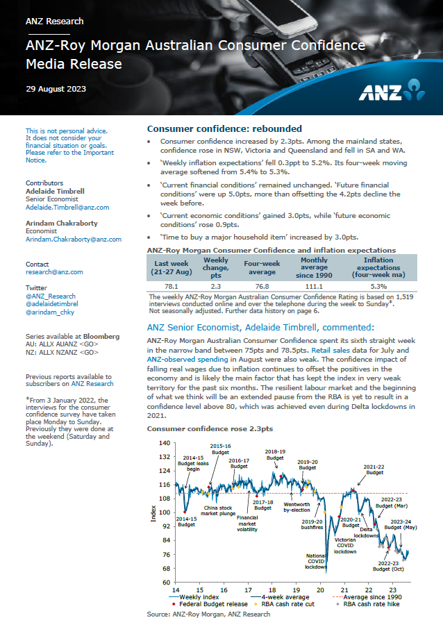 ANZ-Roy Morgan Consumer Confidence was up 2.3pts to 78.1 this week but despite the increase the index has now spent a record 26 straight weeks (equivalent to six months) below the mark of 80. Consumer Confidence is now 6.9pts below the same week a year ago, August 22-28, 2022 (85.0) and is in line with the 2023 weekly average of 78.1.