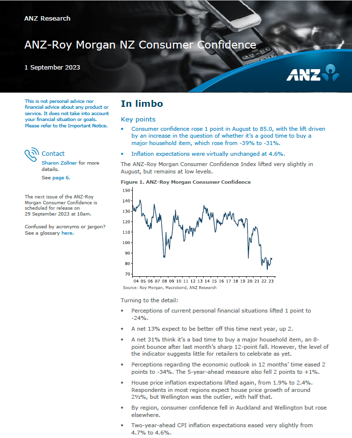 ANZ-Roy Morgan New Zealand Consumer Confidence up 1.3pts to 85.0 in August