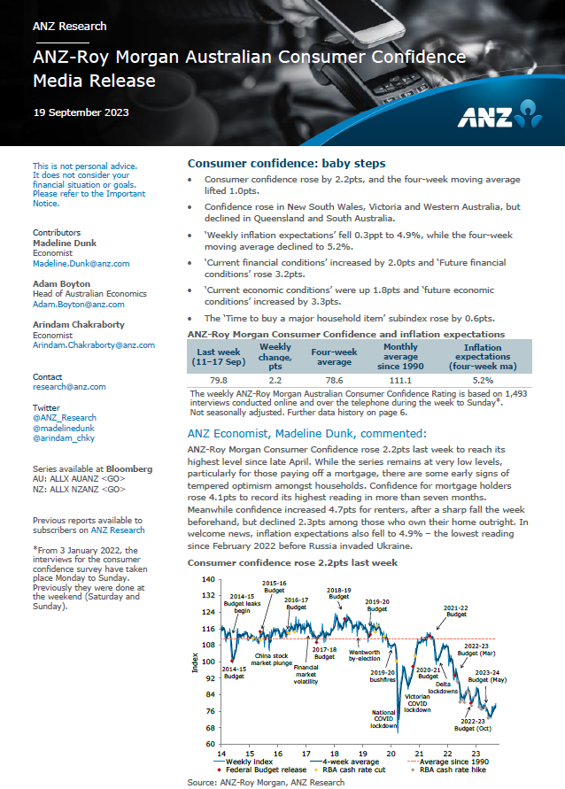 ANZ-Roy Morgan Consumer Confidence was up 2.2pts to 79.8 this week and despite this week’s increase has now spent a record 29 straight weeks (equivalent to almost seven months) below the mark of 80. Consumer Confidence is now 6.2pts below the same week a year ago, September 12-18, 2022 (86.0) and is now 1.6 pts above the 2023 weekly average of 78.2.