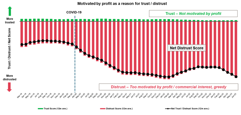 Australians have never been more distrusting of corporate Australia since Roy Morgan began measuring trust and distrust in late 2017. Since 2020, the poor behaviour of corporate Australia under the ‘cover of COVID’ has led to dramatically soaring distrust, not only for individual brands but for corporate Australia.