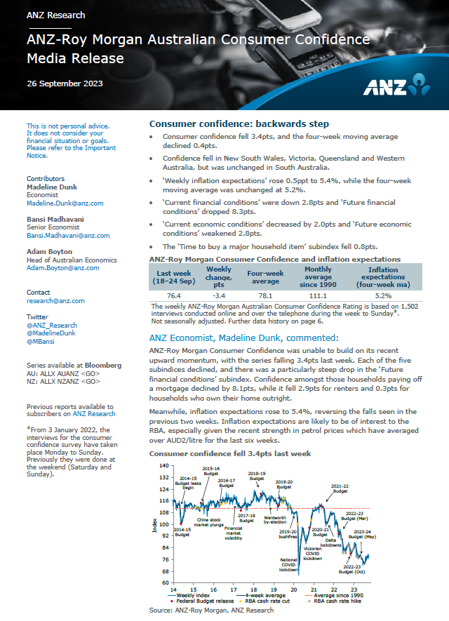 ANZ-Roy Morgan Consumer Confidence down 3.4pts to 76.4 – lowest since mid-August