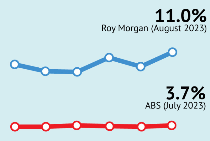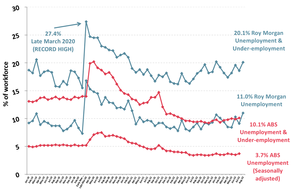 Roy Morgan’s unemployment figure of 11% is almost triple the ABS estimate of 3.7% for July but is in line with the combined ABS unemployment and under-employment figure of 10.1%.