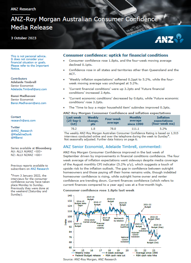 ANZ-Roy Morgan Consumer Confidence up 1.8pts to 78.2