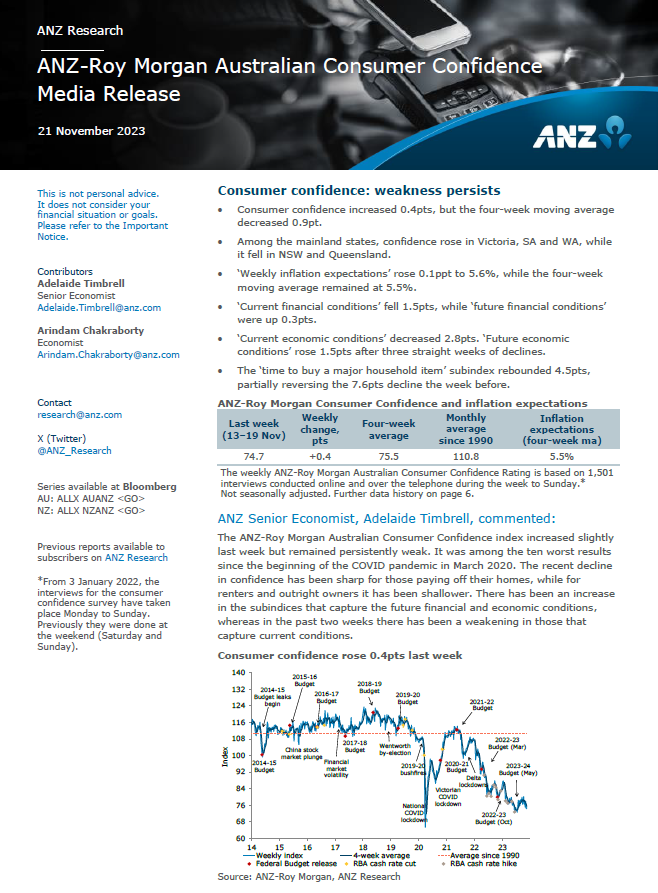 ANZ-Roy Morgan Consumer Confidence was virtually unchanged at 74.7 this week. Consumer Confidence has now spent a record 42 straight weeks below the mark of 85. Consumer Confidence is now 6.9pts below the same week a year ago, November 14-20, 2022 (81.6) and clearly below the 2023 weekly average of 77.9.