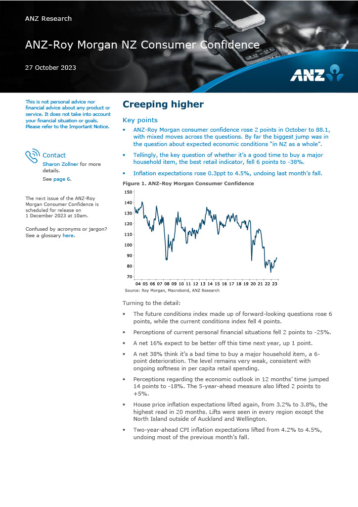 ANZ-Roy Morgan New Zealand Consumer Confidence was up 1.7 points in October to 88.1, with mixed moves across the questions. By far the biggest jump was in the question about expected economic conditions “in NZ as a whole”.