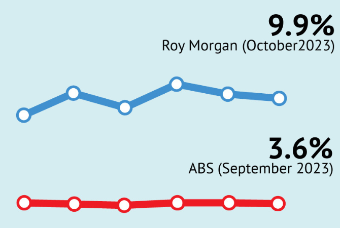 Note: Roy Morgan unemployment estimates are actual data while the ABS estimates are seasonally adjusted.