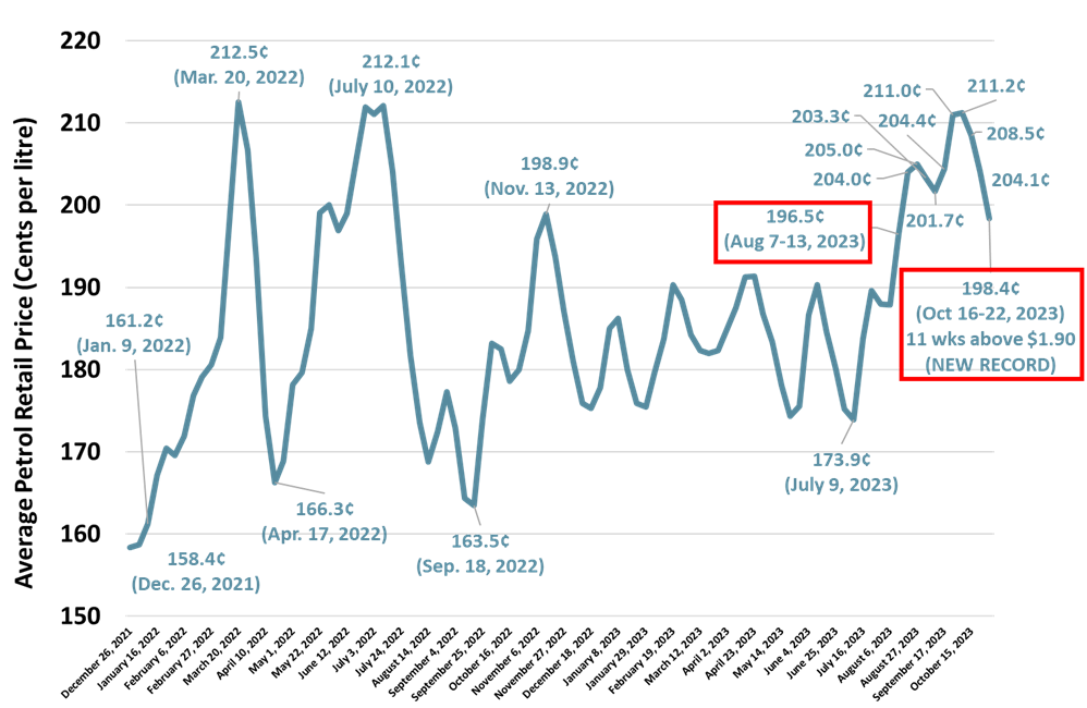 “The elevated retail petrol prices, which have now spent nearly three months at record highs above $1.90 per litre, are generating inflationary pressures in the economy. If these high prices persist the RBA may be forced to increase interest rates again despite pausing and leaving interest rates unchanged at their last four meetings in July, August, September, and October.