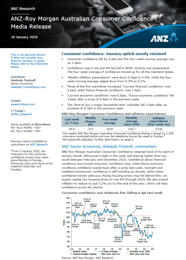 ANZ-Roy Morgan Consumer Confidence was virtually unchanged at 84.4 this week. Consumer Confidence has now spent a record 50 straight weeks below the mark of 85. Consumer Confidence is now 3.3pts below the same week a year ago, January 9-15, 2023 (87.7) and 6.4 points above the 2023 weekly average of 78.0.