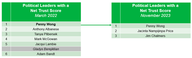 “The high levels of trust in Senator Penny Wong show that she is an asset to the government. While the high levels of trust in Senator Jacinta Nampijinpa Price help to explain how she was able to cut through during the Voice debate, and convince undecided voters to vote no.”