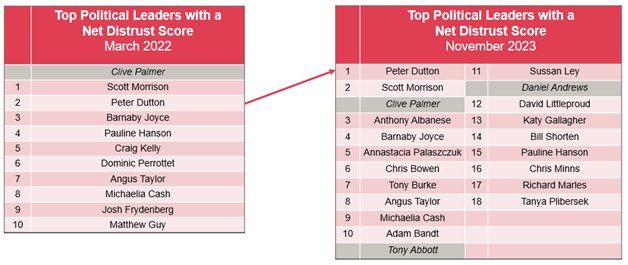 Opposition Leader Peter Dutton emerges as the most distrusted politician, while PM Anthony Albanese also moves into Net Distrust territory, having been a trusted leader in 2022.