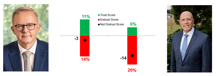 “Prime Minister Albanese has a Net Distrust Score of -3, while Opposition Leader Peter Dutton has a Net Distrust Score of -14 – that’s almost five times worse than the Prime Minister.