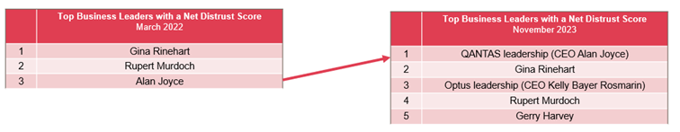 Andrew Forrest is the only business leader to record a Net Trust Score. QANTAS leadership, including former CEO Alan Joyce recorded the Highest Net Distrust Score, surpassing Gina Rinehart.