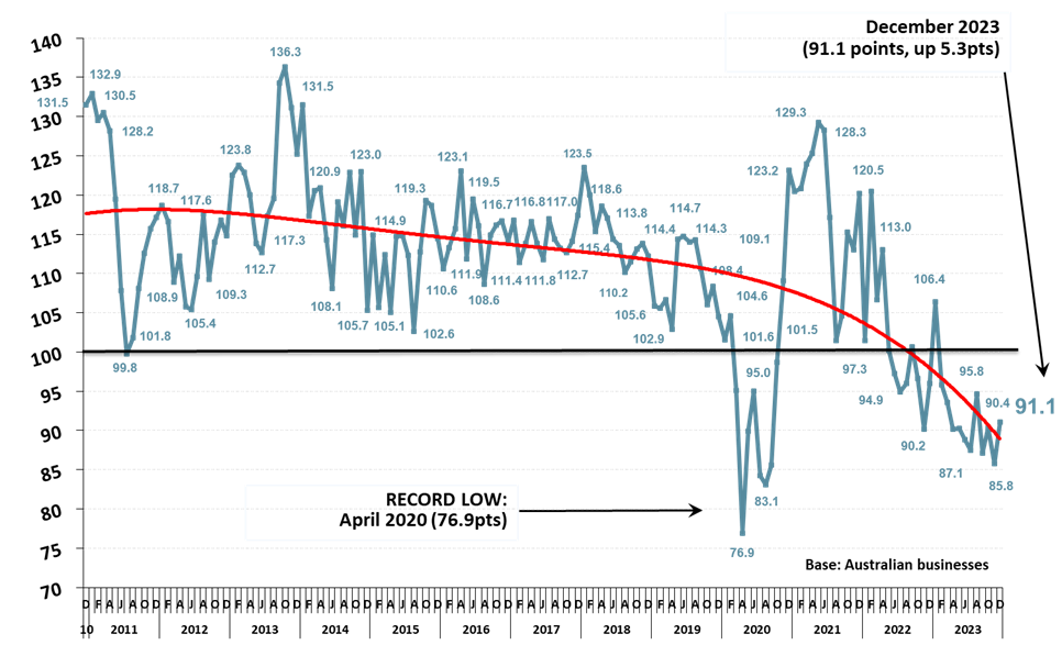 “Roy Morgan Business Confidence rebounded 5.3pts to 91.1 in December. The index has now spent a record eleven straight months (since February 2023) in negative territory below 100.