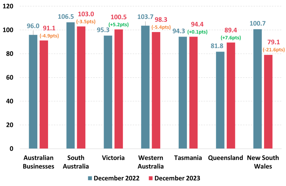 Business Confidence for the month of December increased on a month ago but compared to a year ago is down by 4.9pts since December 2022.