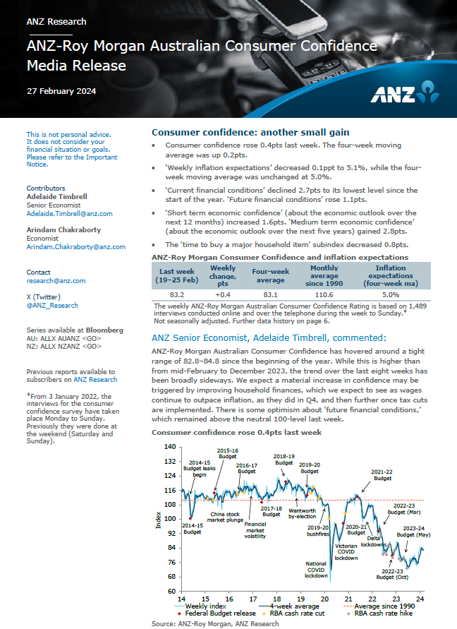 ANZ-Roy Morgan Australian Consumer Confidence has hovered around a tight range of 82.8–84.8 since the beginning of the year. While this is higher than from mid-February to December 2023, the trend over the last eight weeks has been broadly sideways. We expect a material increase in confidence may be triggered by improving household finances, which we expect to see as wages continue to outpace inflation, as they did in Q4, and then further once tax cuts are implemented. There is some optimism about ‘future financial conditions,’ which remained above the neutral 100-level last week.