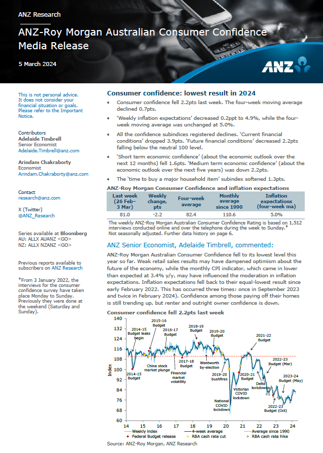 ANZ-Roy Morgan Consumer Confidence Down 2.2pts to 81.0 in early March – lowest since early December 2023