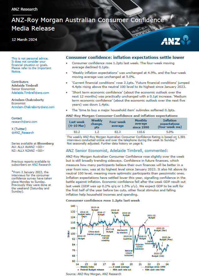 ANZ-Roy Morgan Australian Consumer Confidence rose slightly over the week but is still broadly trending sideways. Confidence in future finances, which measure how many participants believe their own finances will be better in a year from now, was at its highest level since January 2023. It also hit above its neutral 100 level, meaning more optimistic participants than pessimistic ones. Inflation expectations have settled lower this year, signalling confidence in the battle against inflation. Economic confidence fell after the weak GDP result out last week (GDP was up 0.2% q/q or 1.5% y/y). We expect GDP to be soft for the first half of the year before tax cuts, other fiscal stimulus and falling inflation help household incomes and spending.