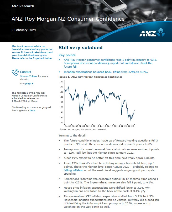 ANZ-Roy Morgan New Zealand Consumer Confidence virtually unchanged at 93.6 in January