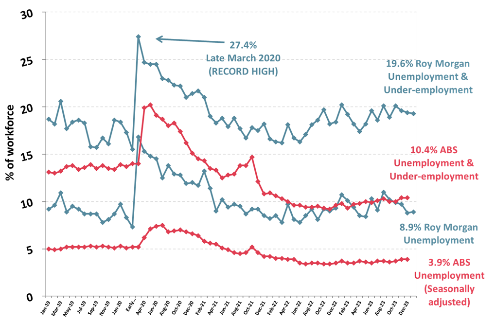 Roy Morgan’s unemployment figure of 8.9% is more than double the ABS estimate of 3.9% for December but is comparable with the combined ABS unemployment and under-employment figure of 10.4%.