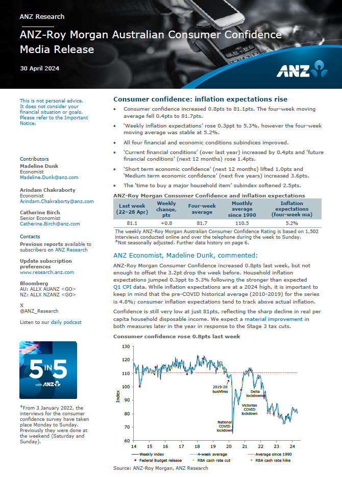 ANZ-Roy Morgan Consumer Confidence increased 0.8pts last week, but not enough to offset the 3.2pt drop the week before. Household inflation expectations jumped 0.3ppt to 5.3% following the stronger than expected Q1 CPI data. While inflation expectations are at a 2024 high, it is important to keep in mind that the pre-COVID historical average (2010-2019) for the series is 4.8%; consumer inflation expectations tend to track above actual inflation. Confidence is still very low at just 81pts, reflecting the sharp decline in real per capita household disposable income. We expect a material improvement in both measures later in the year in response to the Stage 3 tax cuts.