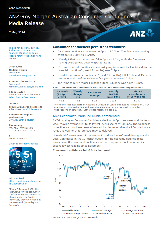 ANZ-Roy Morgan Consumer Confidence dropped 0.6pts to 80.5 this week. The index has now spent a record 66 straight weeks below the mark of 85. Consumer Confidence is now 2.8 points above the same week a year ago, May 1-7, 2023 (77.7), and 2.1 points below the 2024 weekly average of 82.6.