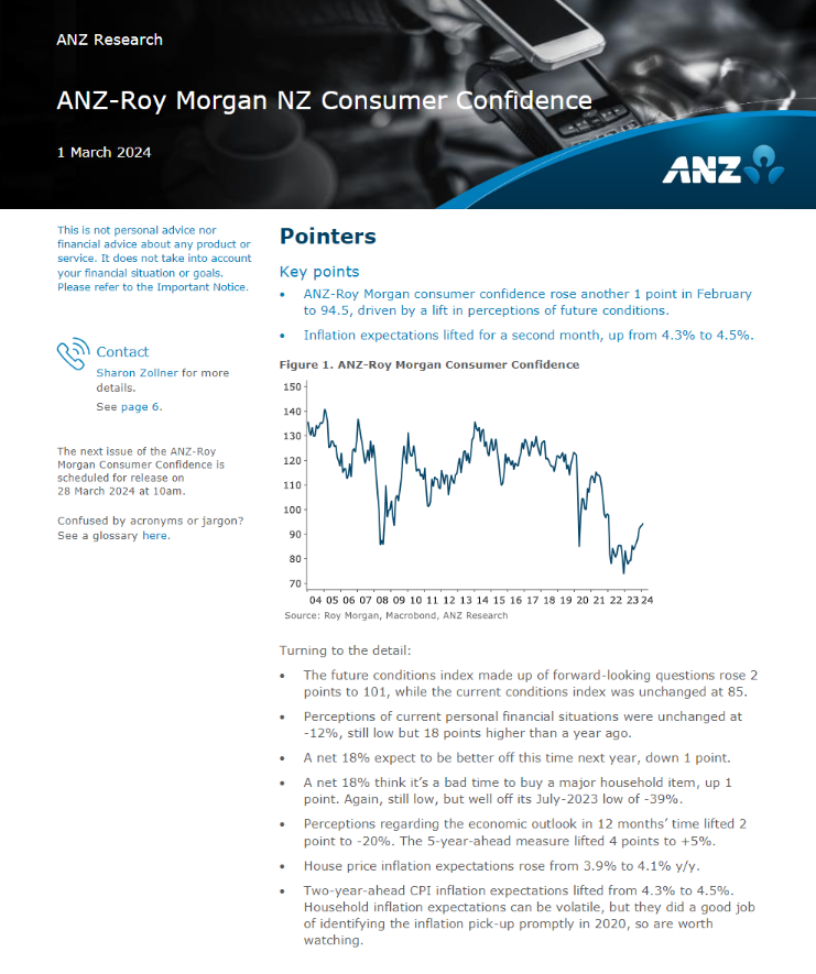 ANZ-Roy Morgan New Zealand Consumer Confidence rose another 0.9 pts in February to 94.5, driven by a lift in perceptions of future conditions - this is the highest Consumer Confidence in New Zealand for over two years since January 2022 (97.7).