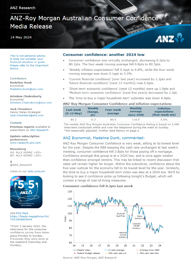 ANZ-Roy Morgan Consumer Confidence was virtually unchanged at 80.2 this week. The index has now spent a record 67 straight weeks below the mark of 85. Consumer Confidence is now 4.3 points above the same week a year ago, May 8-14, 2023 (75.9), and 2.3 points below the 2024 weekly average of 82.5.