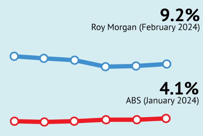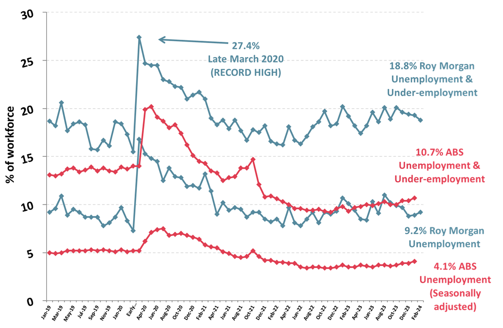 Roy Morgan’s unemployment figure of 9.2% is more than double the ABS estimate of 4.1% for January but is approaching the combined ABS unemployment and under-employment figure of 10.7%.