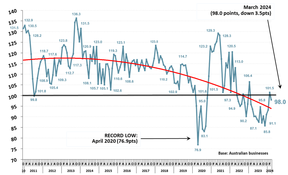 In March 2024, Roy Morgan Business Confidence was 98.0 (down 3.5pts since February 2024) as the index fell back into negative territory despite the Reserve Bank leaving interest rates unchanged.