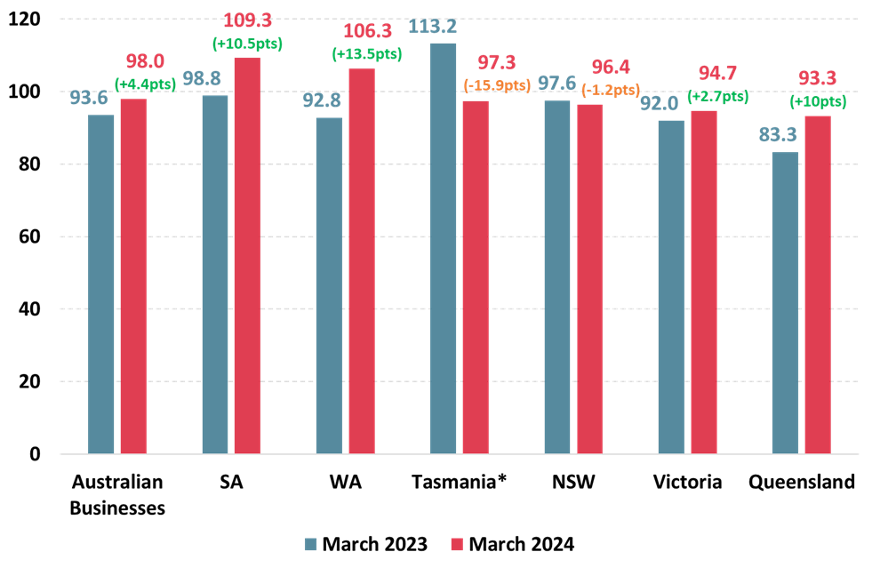 South Australia now has the highest Business Confidence at 109.3, up 10.5pts on a year ago just ahead of Western Australia on 106.3, up 13.5 points compared to March 2023.