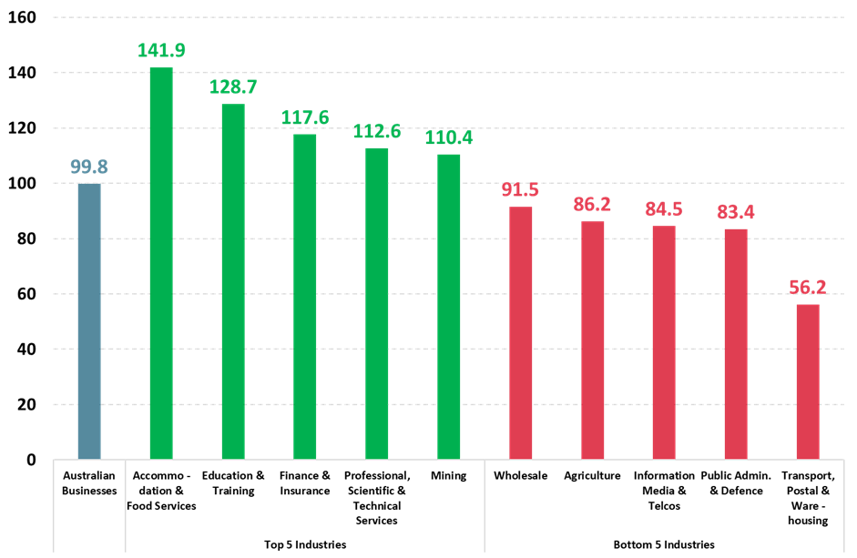 “At an industry level, it is Accommodation & Food Services which is the most confident industry in the Summer months of February-March with a Business Confidence rating of 141.9 and well ahead of second-placed Education & Training (128.7) and third-placed Finance & Insurance (117.6).