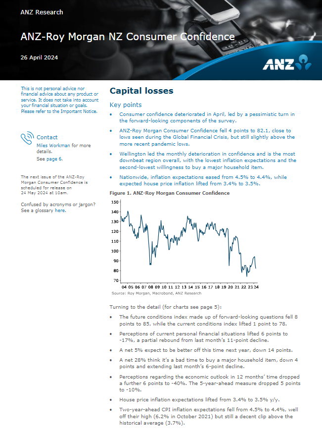 ANZ-Roy Morgan New Zealand Consumer Confidence deteriorated in April, led by a pessimistic turn in the forward-looking components of the survey.