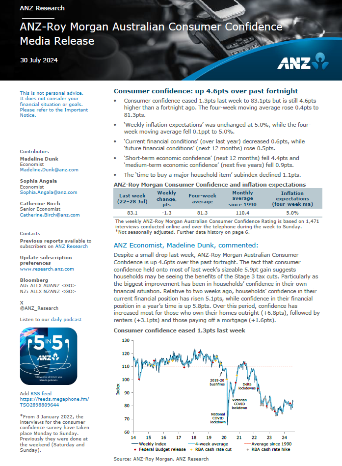 ANZ-Roy Morgan Consumer Confidence eases 1.3pts to 83.1 in late July due to concerns about the Australian economy after biggest weekly jump in over three years