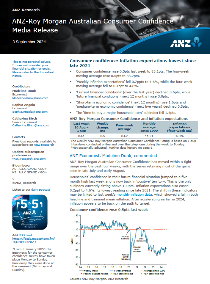 ANZ-Roy Morgan Consumer Confidence virtually unchanged at 83.1 in early September; Inflation Expectations drop to lowest weekly figure since November 2021