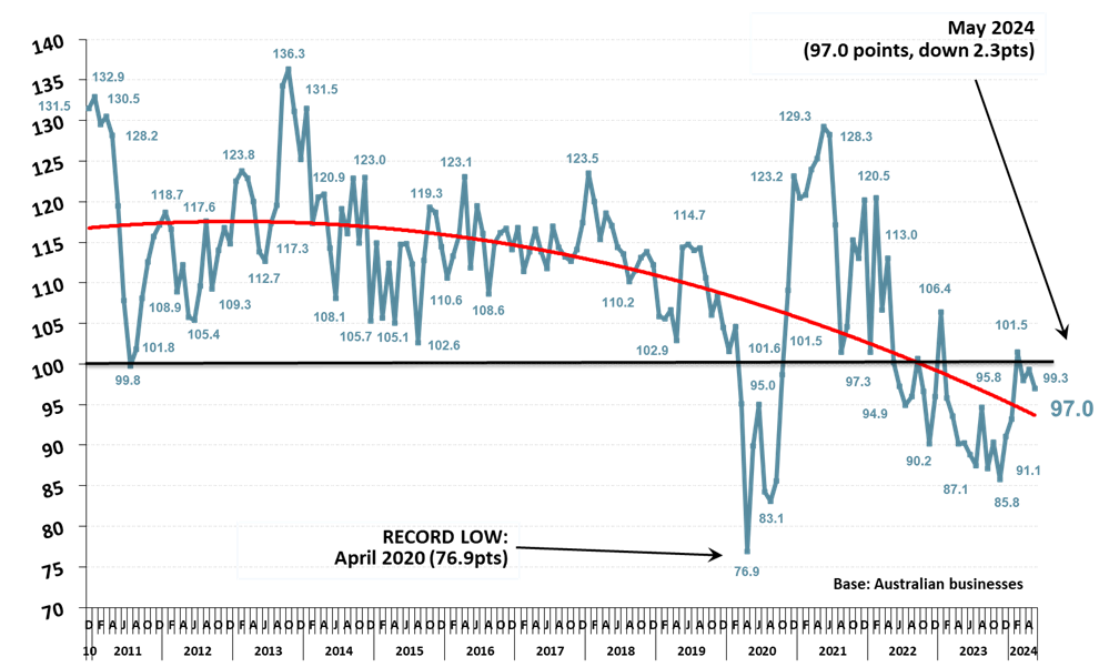 In May 2024, Roy Morgan Business Confidence was 97.0 (down 2.3pts since April 2024) and is still just marginally below the neutral level of 100.