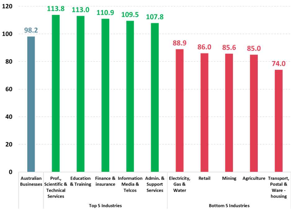 “Also performing well are Information Media & Telecommunications on 109.5, Administration & Support Services on 107.8, Property & Business Services on 102.9, Community Services on 102.6, Public Administration & Defence on 101.6 and Wholesale just above the neutral level of 100 at 101.3.