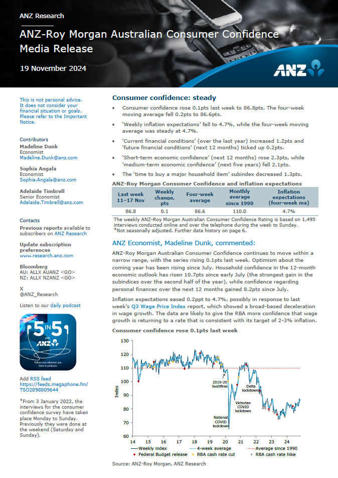 ANZ-Roy Morgan Consumer Confidence virtually unchanged at 86.8 in mid-November – now five weeks above 85