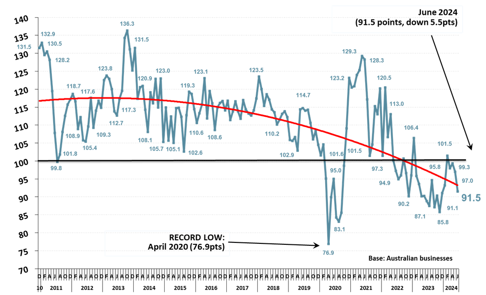 Business Confidence for the month of June was down significantly on May 2024 (down 5.5pts) but still up marginally on a year ago, up 2.7pts on June 2023.