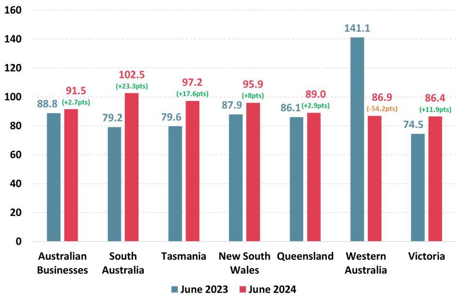 Business Confidence increased by the most in South Australia, up 23.3pts over the last year to 102.5 – and is now the only State above the neutral level of 100 in June 2024. There was also a large rise in Victoria, up 11.9pts to 86.4, and a significant increase in New South Wales, up 8pts to 95.9.