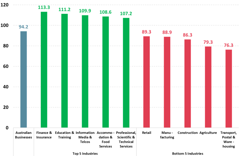 “At an industry level, it is Finance & Insurance which is the most confident industry in the months of May & June with a Business Confidence rating of 113.3 ahead of second-placed Education & Training (111.2) and third-placed Information, Media & Telecommunications (109.9).