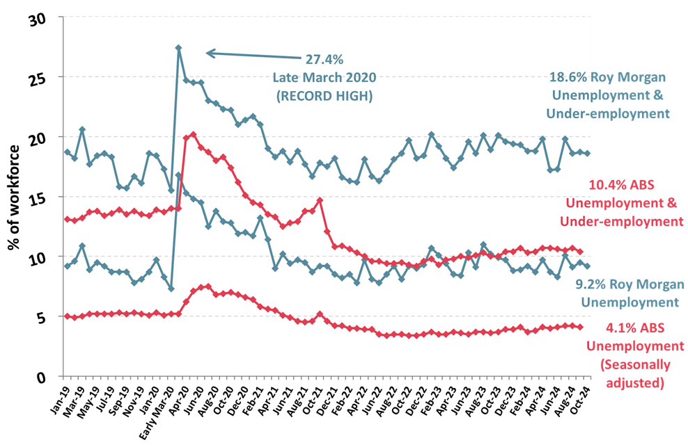 Roy Morgan’s unemployment figure of 9.2% is clearly more than double the ABS estimate of 4.1% for September but is approaching the combined ABS unemployment and under-employment figure of 10.4%.