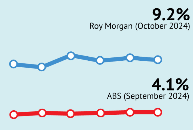 Note: Roy Morgan unemployment estimates are actual data while the ABS estimates are seasonally adjusted.