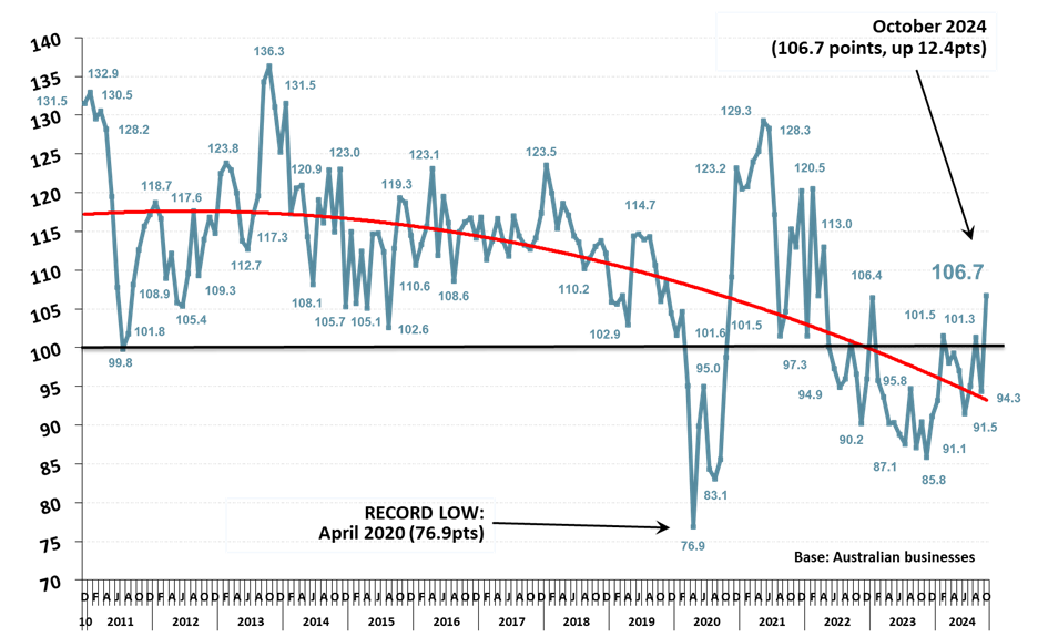 Business Confidence increased 12.4pts to 106.7 in October as businesses expect ‘good times’ over the next year and say the next 12 months is a ‘good time to invest’ in growing the business: