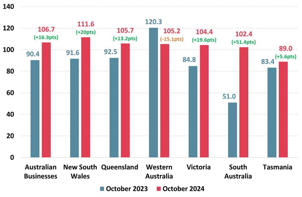 Business Confidence for the month of October increased significantly on a month ago (up 12.4pts) and up by even more on a year ago, up 16.3pts on October 2023. The increase in Business Confidence from a year ago has been driven by large increases in States of New South Wales, Victoria, Queensland and South Australia with increases by at least 10 points.