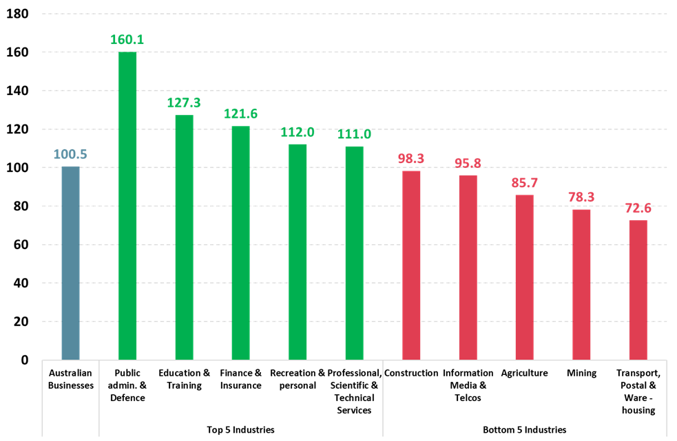 “At an industry level, it is Public Administration & Defence which is the most confident industry in the months of September & October with a Business Confidence rating of 160.1 ahead of Education & Training (127.3), Finance & Insurance (121.6) and Recreation & Personal (112.0).