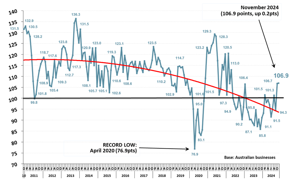 In November 2024, Roy Morgan Business Confidence was 106.9 (virtually unchanged from October 2024) after the Reserve Bank left interest rates unchanged at a 13-year high of 4.35%.