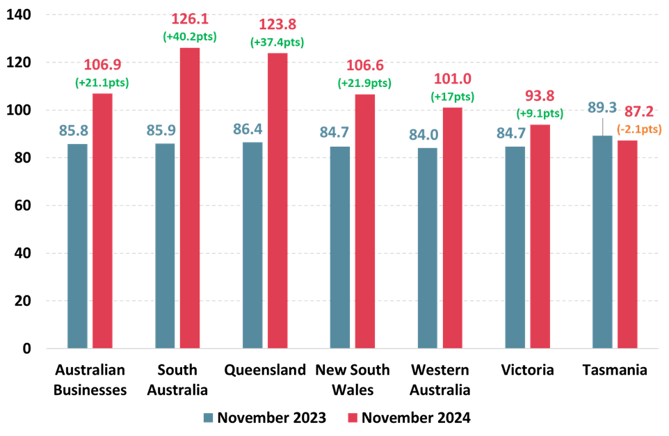 Business Confidence for the month of November was virtually unchanged on a month ago (up 0.2pts), but up significantly on a year ago, up 21.1pts from November 2023. The increase in Business Confidence from a year ago has been driven by large increases in the States of New South Wales, Queensland, Western Australia, and South Australia with increases by at least 15 points.