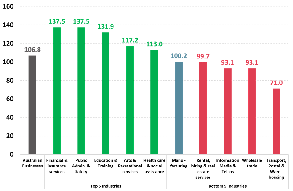 “At an industry level, it is Financial & Insurance Services and Public Administration & Defence which are the most confident industries in the months of October & November with a Business Confidence rating of 137.5 ahead of Education & Training (131.9) and Arts & Recreational Services (117.2).